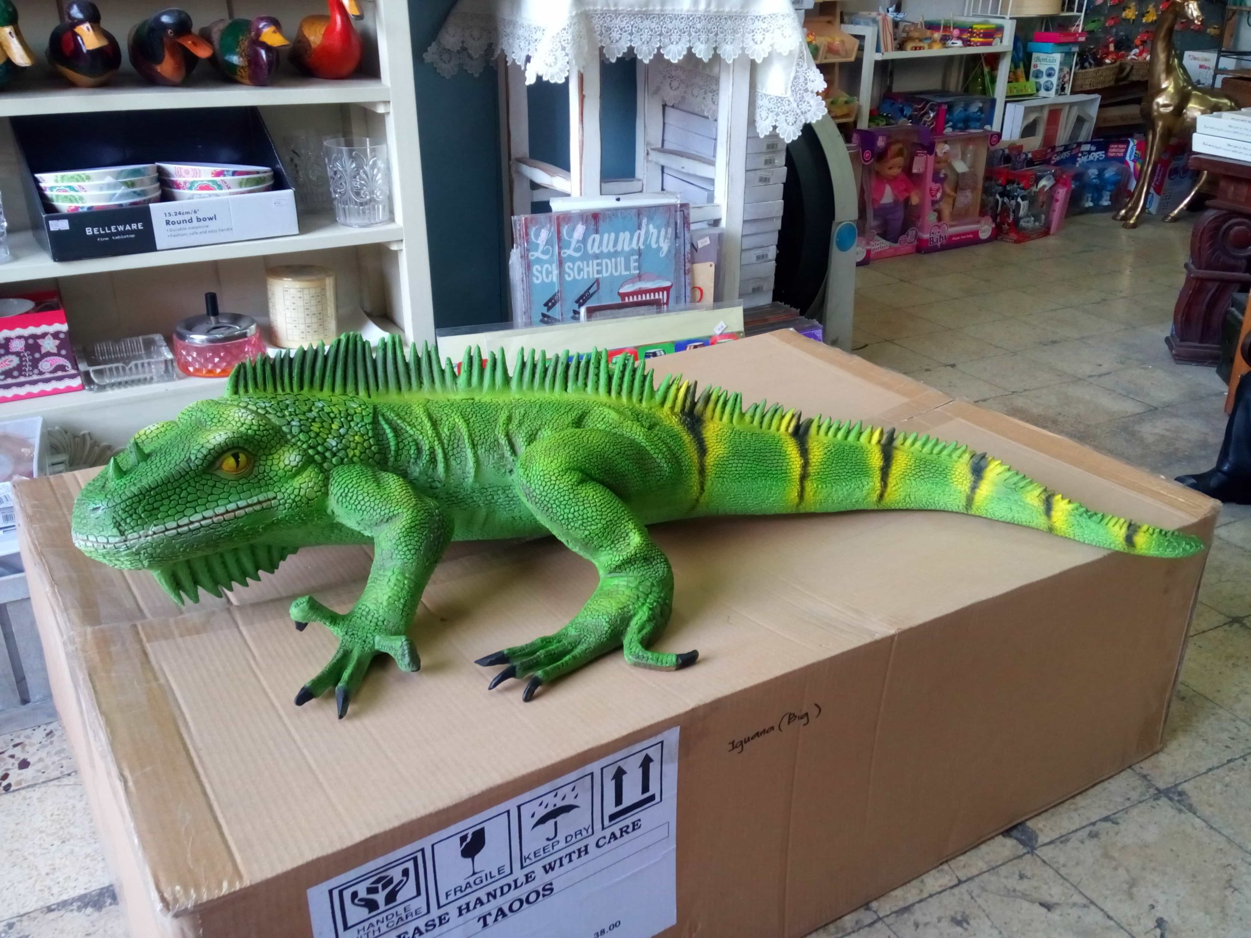 פסל איגואנה שחור לבן עשוי מפיברגלס מתאים לתנאי חוץ.