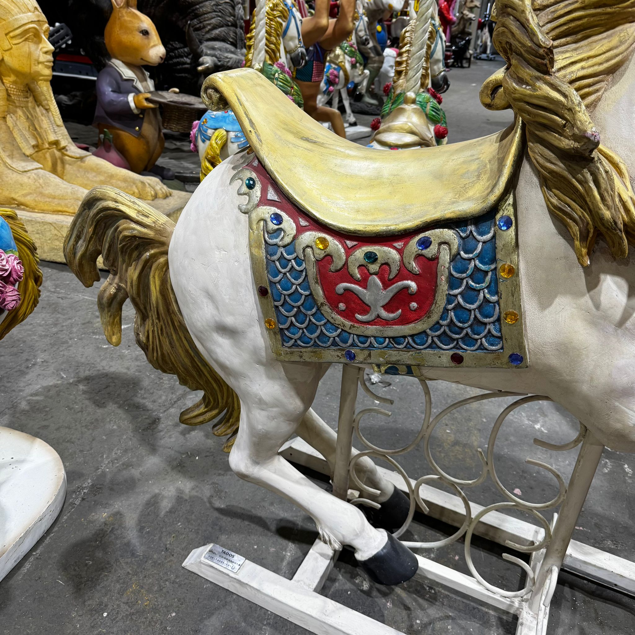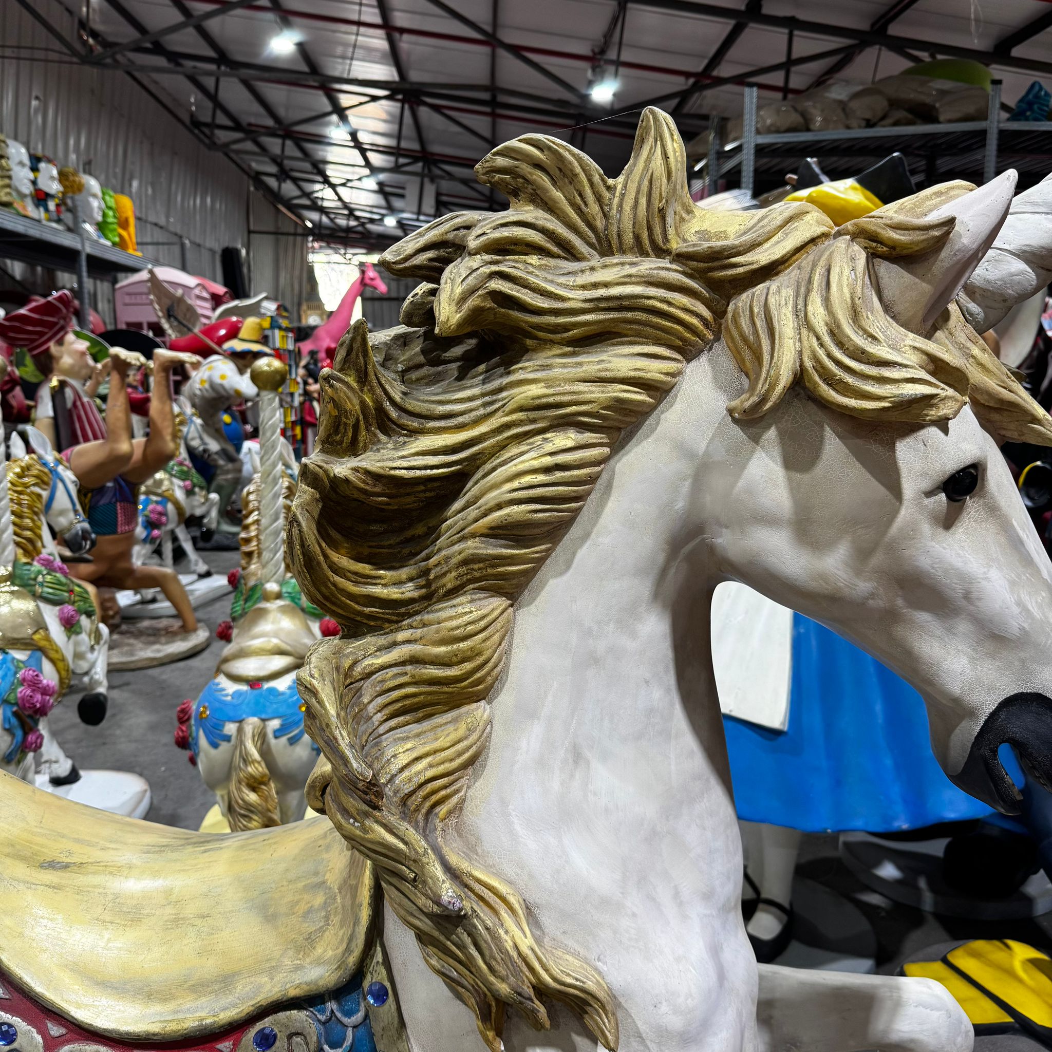 פסל של סוס חד קרן עשוי מפיברגלס מתאים לתנאי חוץ.