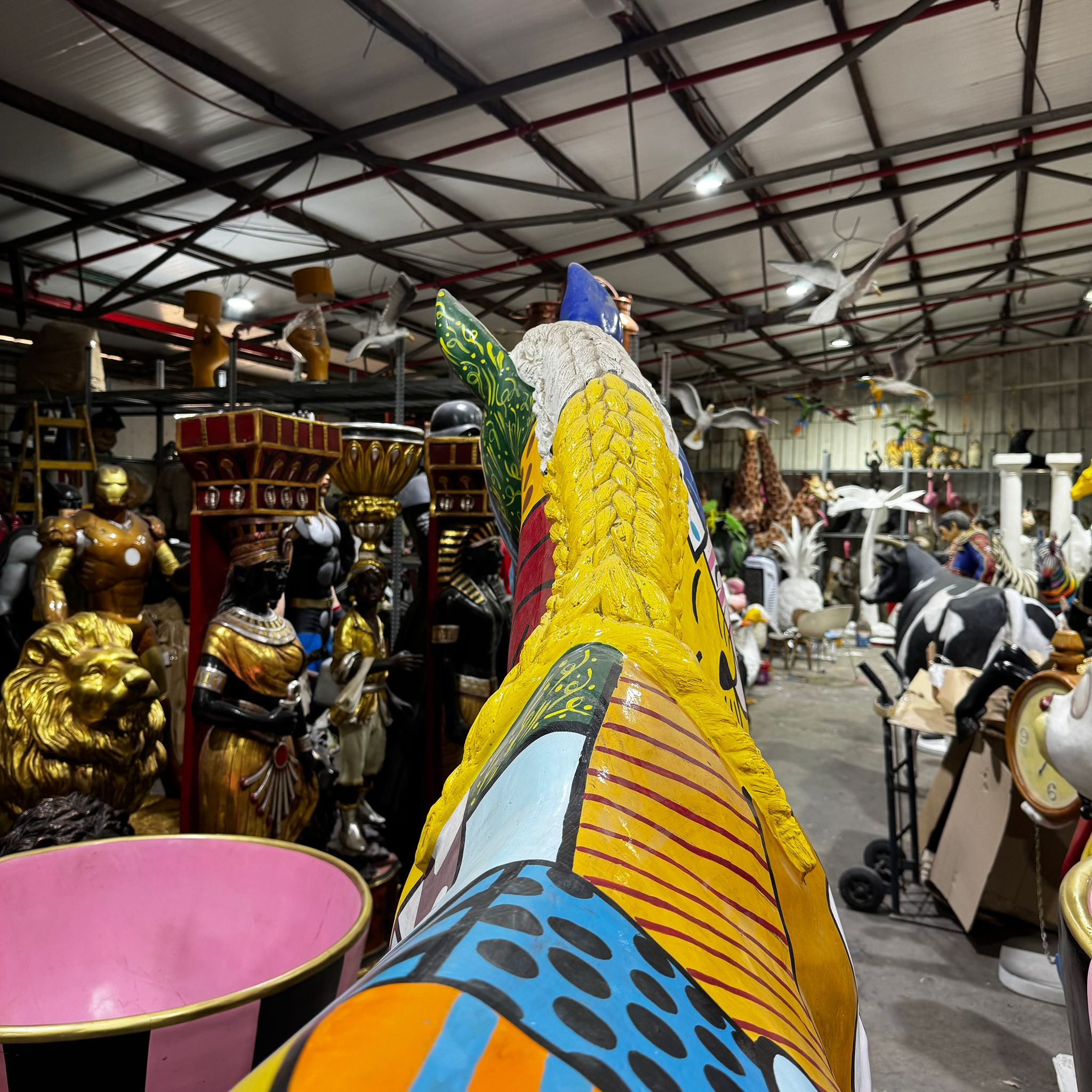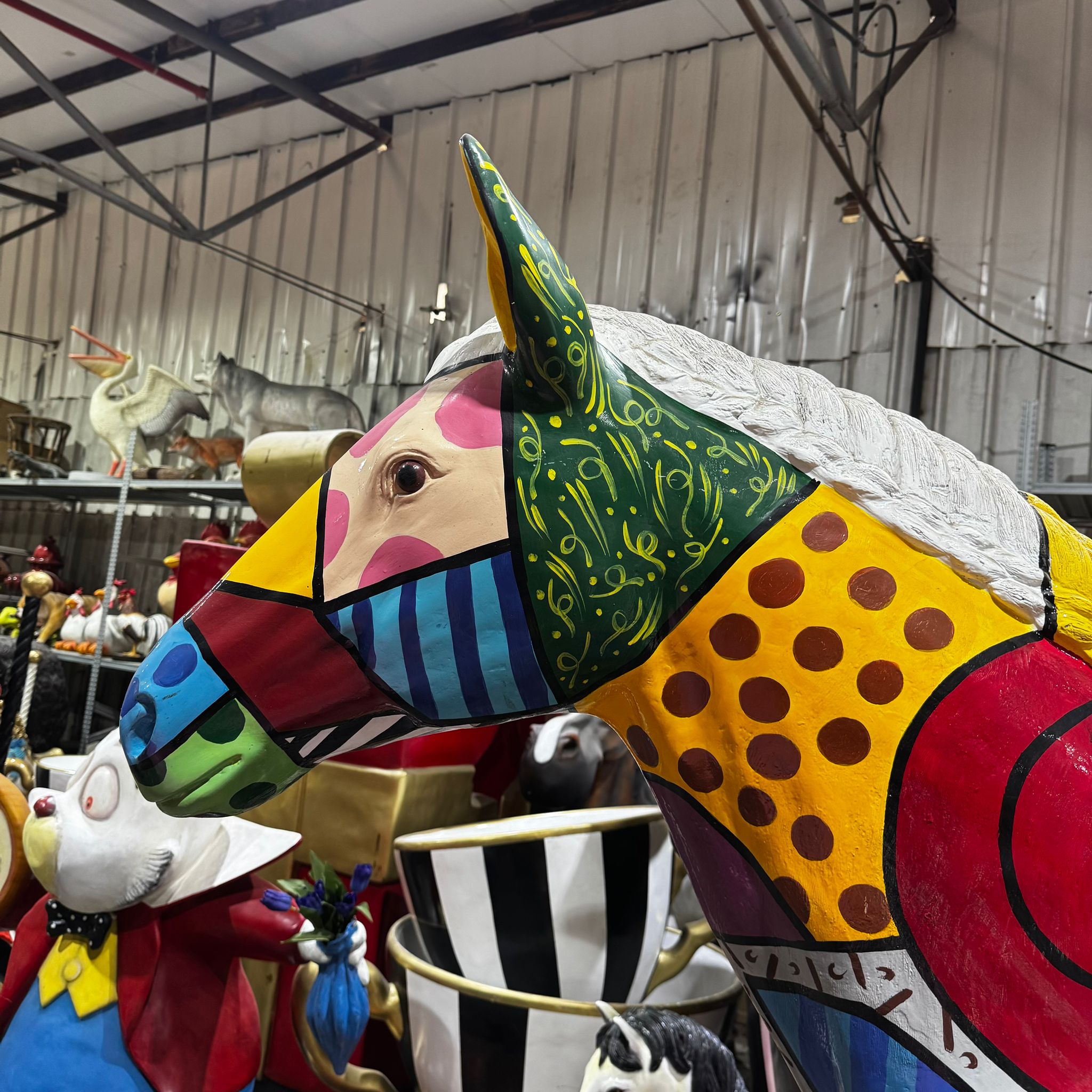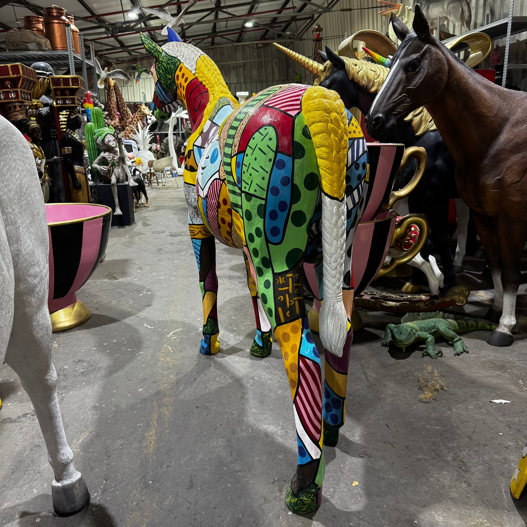 פסל סוס בפופ ארט עשוי מפיברגלס איכותי, עמיד בתנאי חוץ.