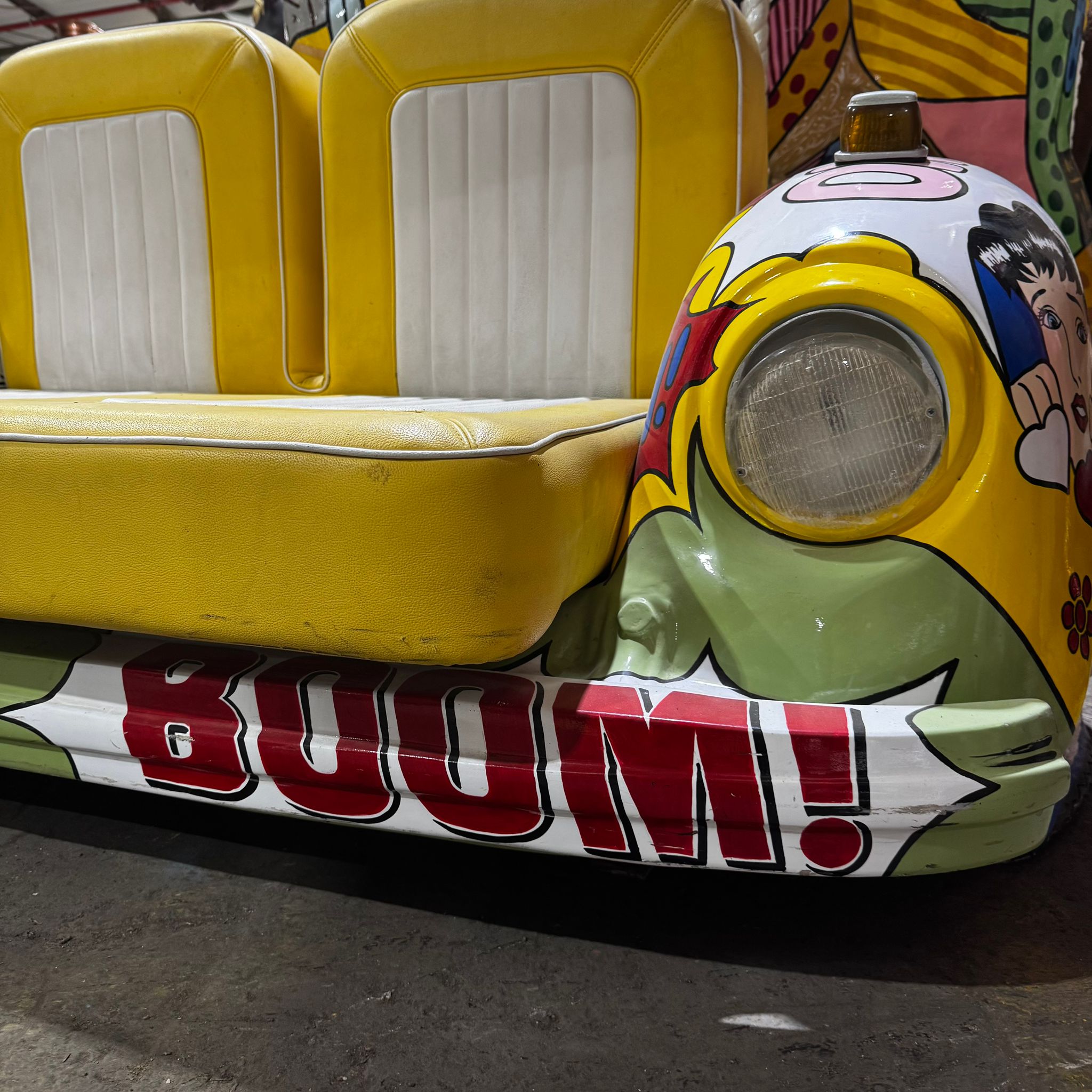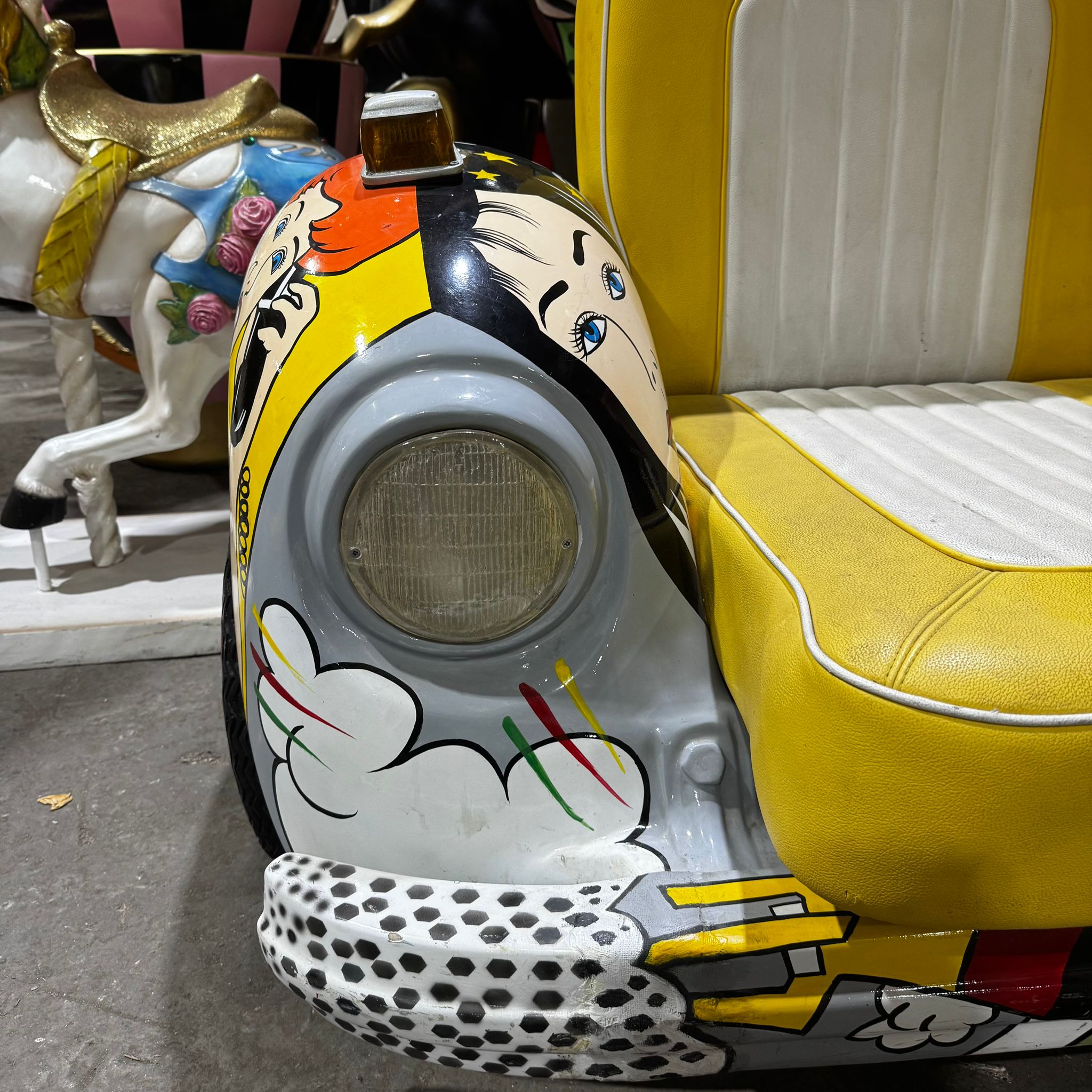 ספה בצורת רכב חיפושית בפופ ארט, הספה עשויה מפיברגלס ועליו מצויר בעבודת יד ציור מיוחדת של אומנות הפופ ארט.