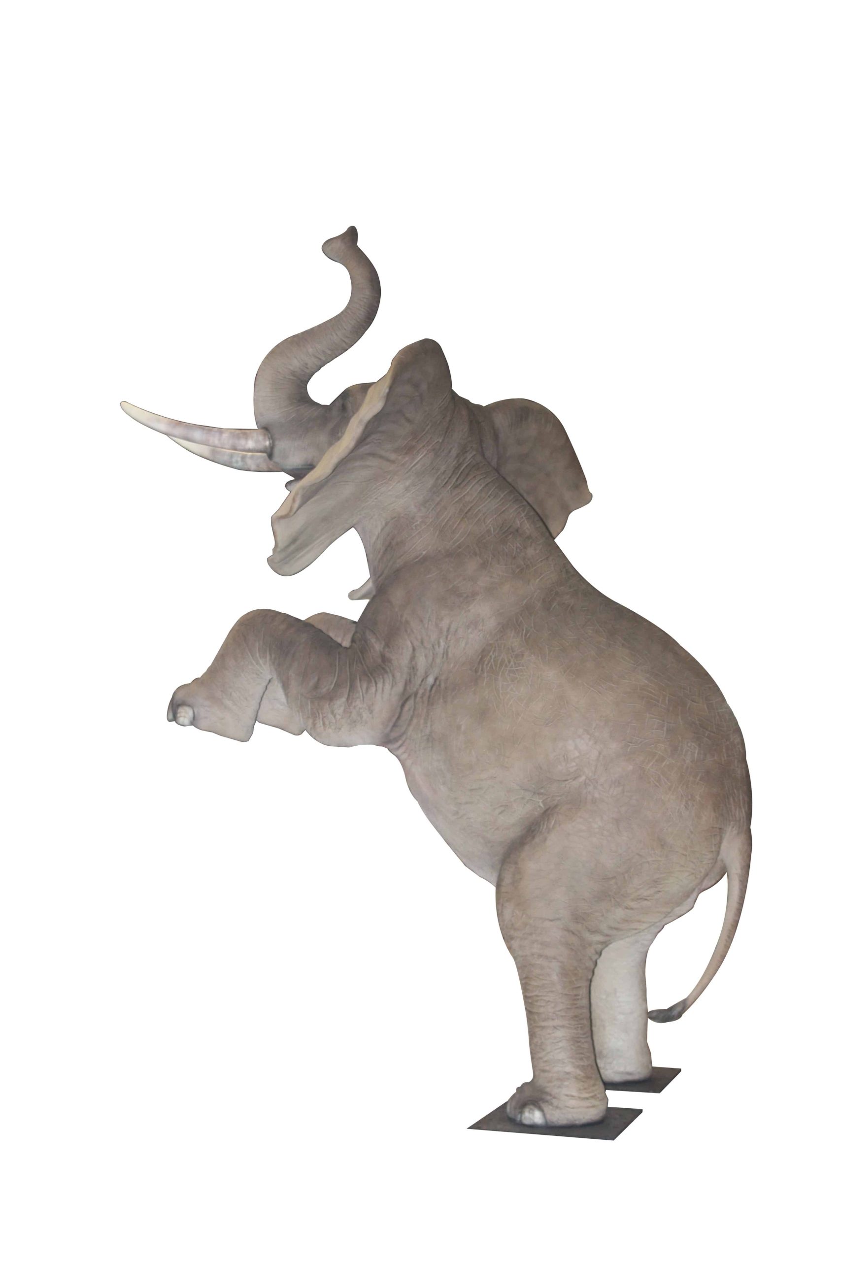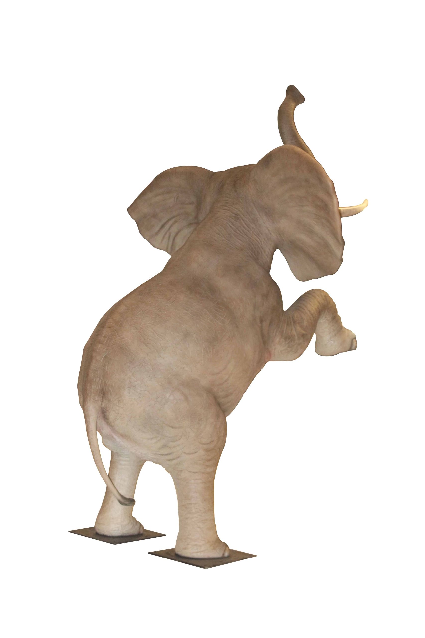 פסל של פיל מקפץ עשוי מפיברגלס, מתאים לקישוט גינות וגנים.