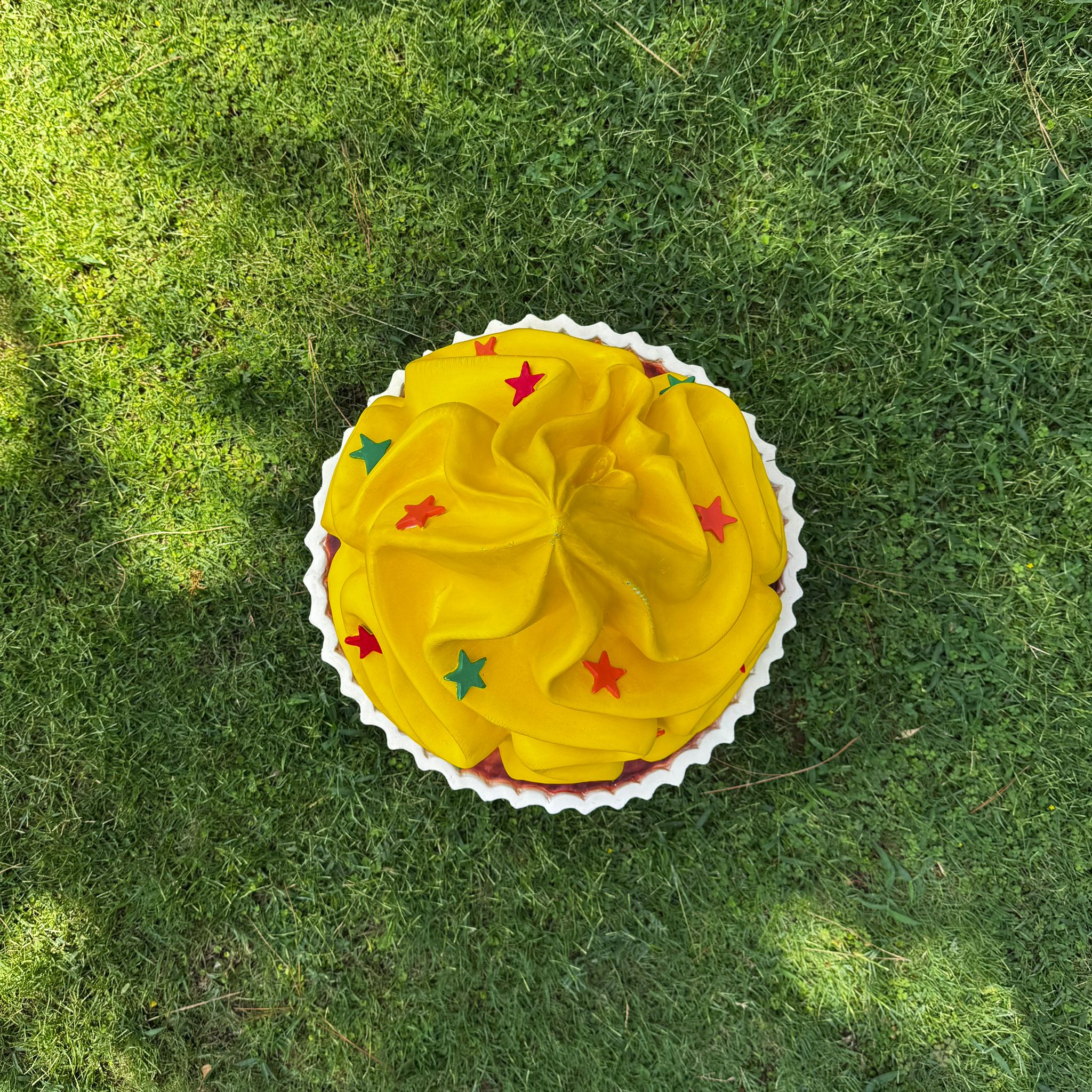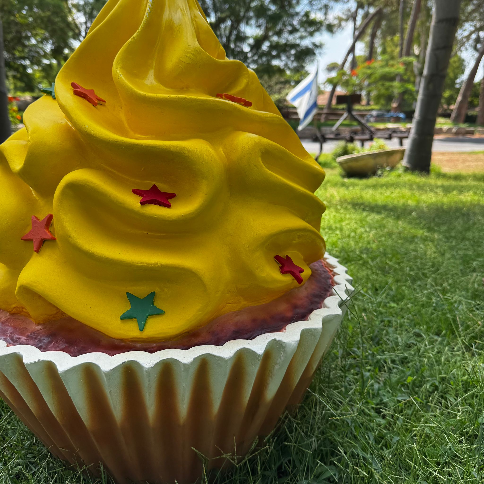 פסל קאפקייקס צהוב עשוי מפיברגלס מתאים לתנאי חוץ.